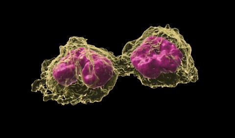 This image was acquired using the Leica TCS SP8 X confocal scope, and applying a Z-stack acquisition modality to grab several focal planes along the Z-axis (to cover the entire volume of the cells). All focal planes were recomposed to create a 3D rendering of the cells and the image was exported and post-processed using the Imaris 9.7 image analysis software. The resulting image shows two monocytes, where nuclei (displaying the typical horseshoe shape) are depicted in violet and the plasma membrane in yellow with transparency.
